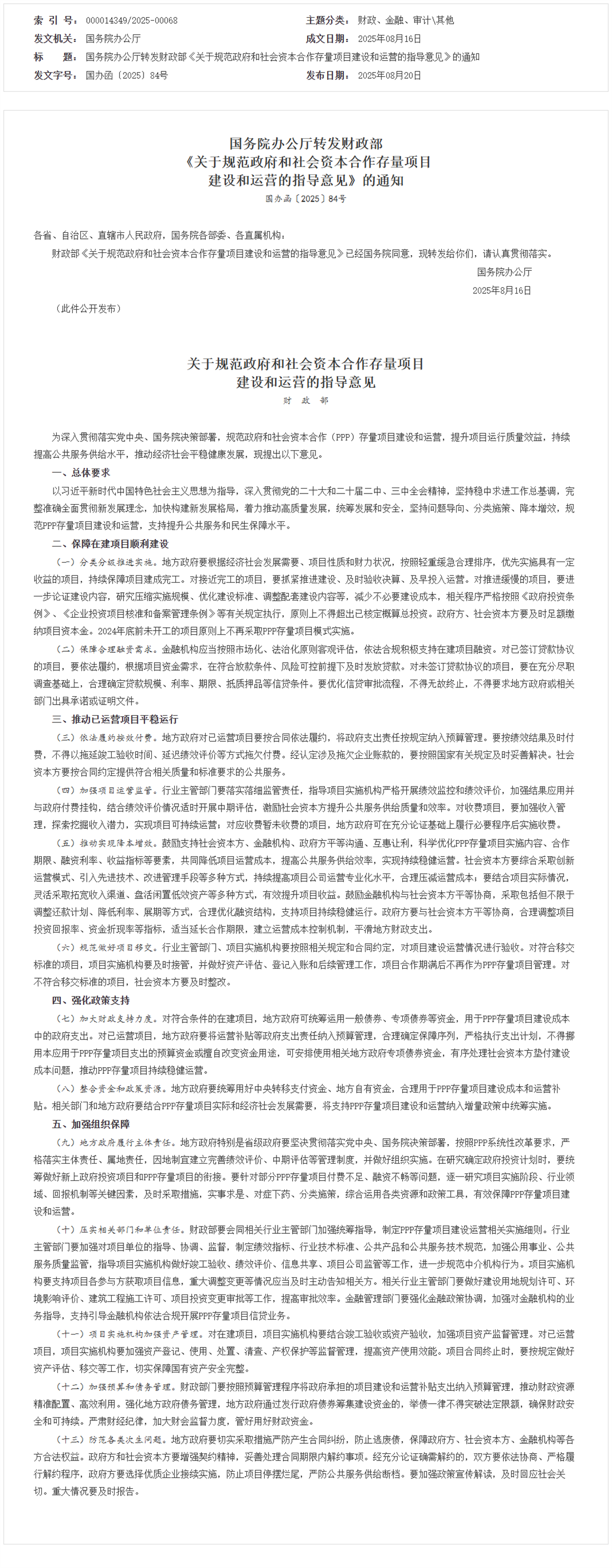 国办转发《关于规范政府和社会资本合作存量项目建设和运营的指导意见》
