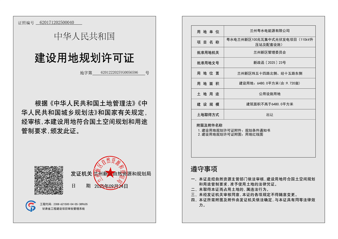 关于公示粤水电兰州新区100兆瓦集中式光伏发电项目(110kv升压站及配套设施)《建设用地规划许可证》的公告