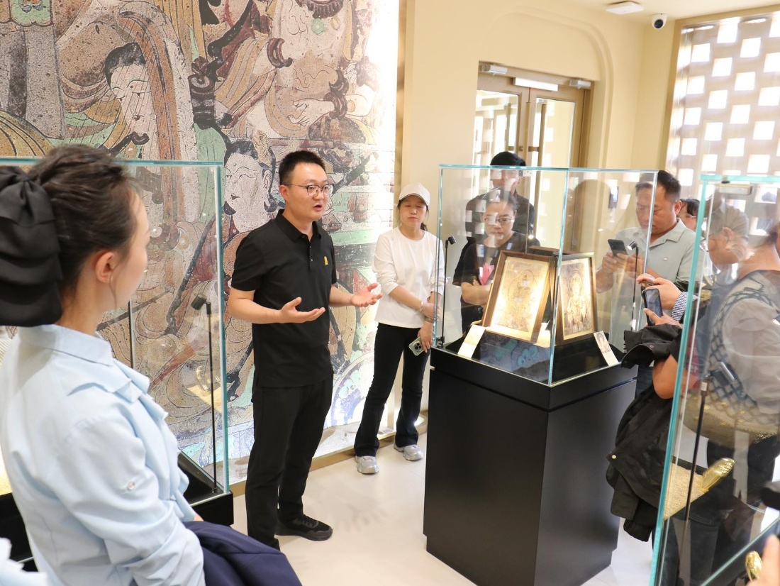 “真漂亮呀”“好有浓厚的敦煌韵味”……展柜里的“丝路遗韵”产品,牢牢吸引了学员们的目光,大家围着展柜细细观看,连声赞叹。