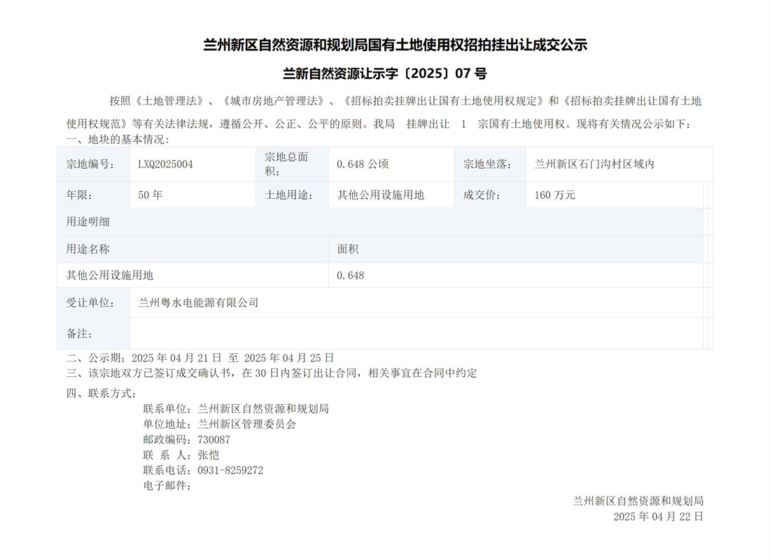 兰州新区自然资源和规划局国有土地使用权招拍挂出让成交公示