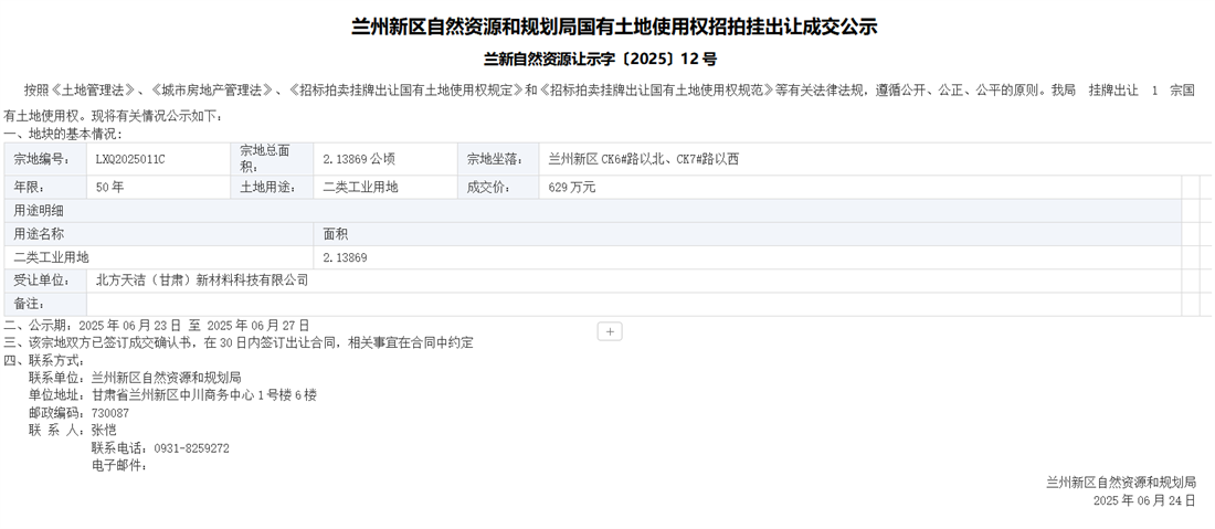 兰州新区自然资源和规划局国有土地使用权招拍挂出让成交公示