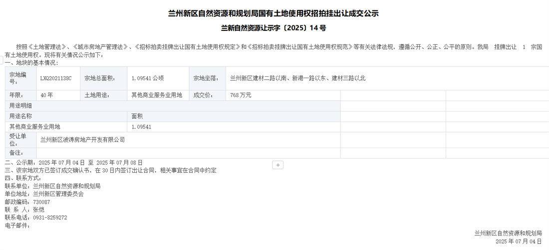 兰州新区自然资源和规划局国有土地使用权招拍挂出让成交公示